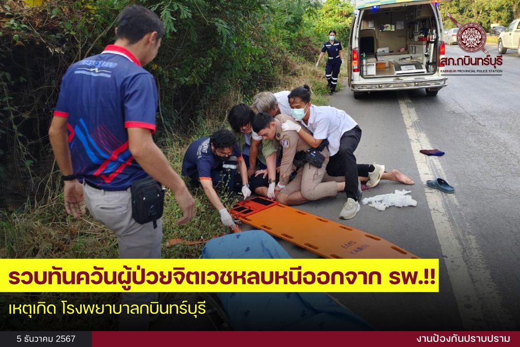 วันที่ 5 ธ.ค.67 ร.ต.อ.ธีรพงษ์​ เดช​อำ​พร​ภิญโญ รอง สวป.สภ.กบินทร์บุรี ร้อยเวรป้องกันปราบปราม พร้อมกำลังสายตรวจ เข้าระงับเหตุตามที่ได้รับแจ้งจากศูนย์วิทยุ 191 ปราจีนบุรี เหตุคนไข้อาละวาด สถานที่เกิดเหตุ โรงพยาบาลกบินทร์บุรี เจ้าหน้าที่ตำรวจเข้าตรวจสอบเป็นผู้ป่วยจิตเวช ได้หลบหนีออกจากโรงพยาบาล เจ้าหน้าที่ตำรวจและส่วนที่เกี่ยวข้องสามารถควบคุมตัวไว้ได้ นำตัวส่งทางโรงพยาบาลเข้ารับการรักษาต่อไป