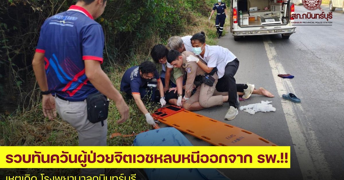 วันที่ 5 ธ.ค.67 ร.ต.อ.ธีรพงษ์​ เดช​อำ​พร​ภิญโญ รอง สวป.สภ.กบินทร์บุรี ร้อยเวรป้องกันปราบปราม พร้อมกำลังสายตรวจ เข้าระงับเหตุตามที่ได้รับแจ้งจากศูนย์วิทยุ 191 ปราจีนบุรี เหตุคนไข้อาละวาด สถานที่เกิดเหตุ โรงพยาบาลกบินทร์บุรี เจ้าหน้าที่ตำรวจเข้าตรวจสอบเป็นผู้ป่วยจิตเวช ได้หลบหนีออกจากโรงพยาบาล เจ้าหน้าที่ตำรวจและส่วนที่เกี่ยวข้องสามารถควบคุมตัวไว้ได้ นำตัวส่งทางโรงพยาบาลเข้ารับการรักษาต่อไป