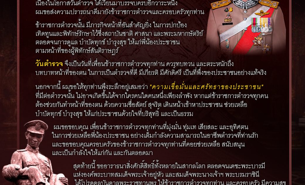 ผมขอขอบคุณ เพื่อนข้าราชการตำรวจทุกท่านที่มุ่งมั่น ทุ่มเท เสียสละ และอุทิศตนในการช่วยเหลือพี่น้องประชาชน อย่างเต็มกำลังความสามารถในอาชีพตำรวจที่ท่านรัก และขอขอบคุณครอบครัวของข้าราชการตำรวจทุกท่านที่คอยช่วยเหลือ สนับสนุน และเป็นกำลังใจให้แก่กัน และกันตลอดมา..”