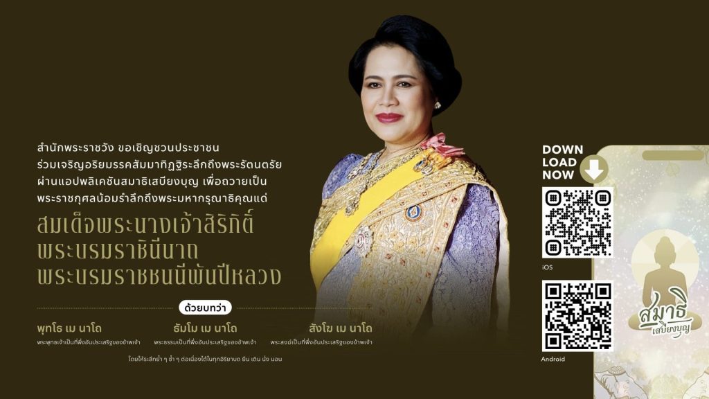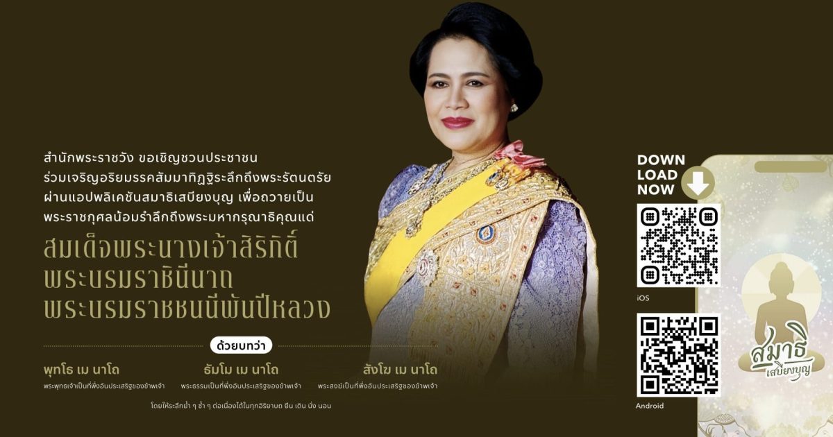สำนักพระราชวัง ขอเชิญชวนประชาชนร่วมเจริญอริยมรรค “สัมมาทิฏฐิ” ระลึกถึงพระรัตนตรัย ด้วยบทว่า พุทโธ เม นาโถ (พระพุทธเจ้าเป็นที่พึ่งอันประเสริฐของข้าพเจ้า) ธัมโม เม นาโถ (พระธรรมเป็นที่พึ่งอันประเสริฐของข้าพเจ้า) สังโฆ เม นาโถ (พระสงฆ์เป็นที่พึ่งอันประเสริฐของข้าพเจ้า) (โดยให้ระลึกย้ำ ๆ ซ้ำ ๆ ต่อเนื่องได้ในทุกอิริยาบถ ยืน เดิน นั่ง นอน) ถวายเป็นพระราชกุศลน้อมรำลึกถึงพระมหากรุณาธิคุณ สมเด็จพระนางเจ้าสิริกิติ์ พระบรมราชินีนาถ พระบรมราชชนนีพันปีหลวง ทั้งนี้ สามารถดาวน์โหลดแอปพลิเคชันได้ทั้ง PLAY STORE และ APP STORE