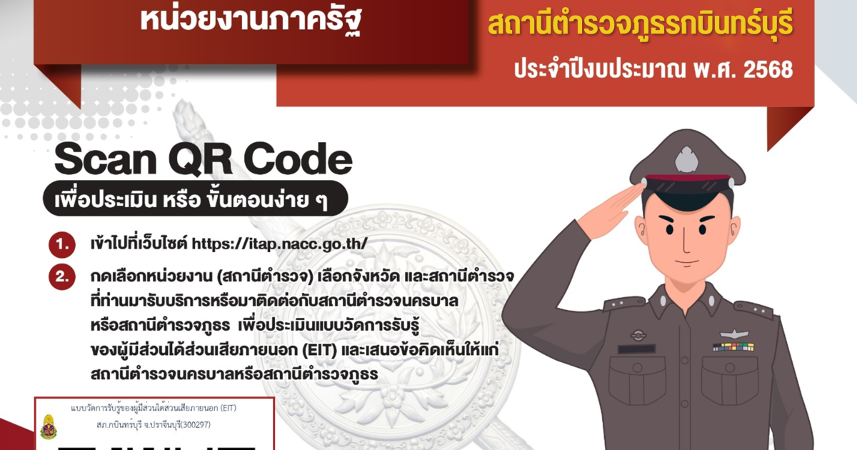 สถานีตำรวจภูธรกบินทร์บุรี ขอเชิญชวน ผู้มารับบริการหรือมาติดต่อราชการ สถานีตำรวจ ร่วมจัดทำ แบบวัดการรับรู้ของผู้มีส่วนได้ส่วนเสียภายนอก (External Integrity & Transparency Assessment: EIT) 2025 สำหรับนำไปพัฒนาปรับปรุงการให้บริการของสถานีตำรวจต่อไป ตั้งแต่วันที่ 1 มกราคม 2568 จนถึง 30 มิถุนายน 2568 สามมารถกดลิงก์ : https://itap.nacc.go.th/s/F76735113