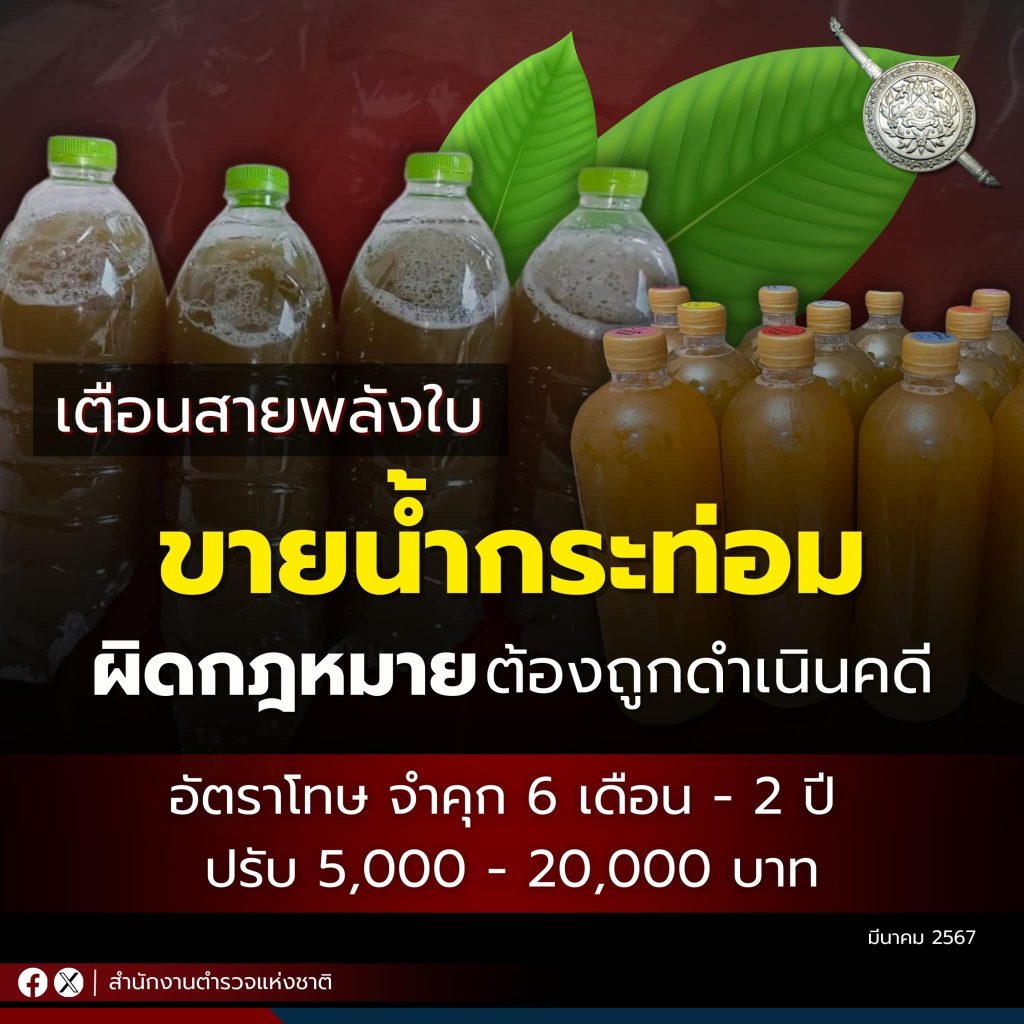 เตือนสายพลังใบ 12 มีนาคม 2567 โดย kabinburi / กฎหมายน่ารู้,ข่าวประชาสัมพันธ์,ข่าวประชาสัมพันธ์,ข่าวฝากประชาสัมพันธ์ เตือนสายพลังใบขาย “น้ำกระท่อม” ผิดกฎหมายต้องถูกดำเนินคดีมีอัตราโทษจำคุก 6 เดือน – 2 ปีปรับ 5,000 – 20,000 บาทด้วยความปรารถนาดีจากสำนักงานตำรวจแห่งชาติ