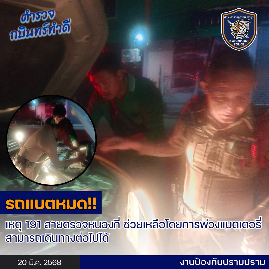 วันที่ 20 มี.ค.68 เวลา 03.30 น. ร.ต.ท.อาคม แนวสุข รอง สว.(ป.)สภ.กบินทร์บุรี พร้อมกำลังสายตรวจหนองกี่ ออกเหตุ 191 ประชาชนขอความช่วยเหลือรถยนต์เก๋งสตาร์ทไม่ติด สถานที่เกิดเหตุ ร้านมินิบิ๊กซีตลาดเจริญทรัพย์ ให้ความช่วยเหลือพ่วงแบตเตอรี่ให้ สามารถเดินทางต่อไปได้