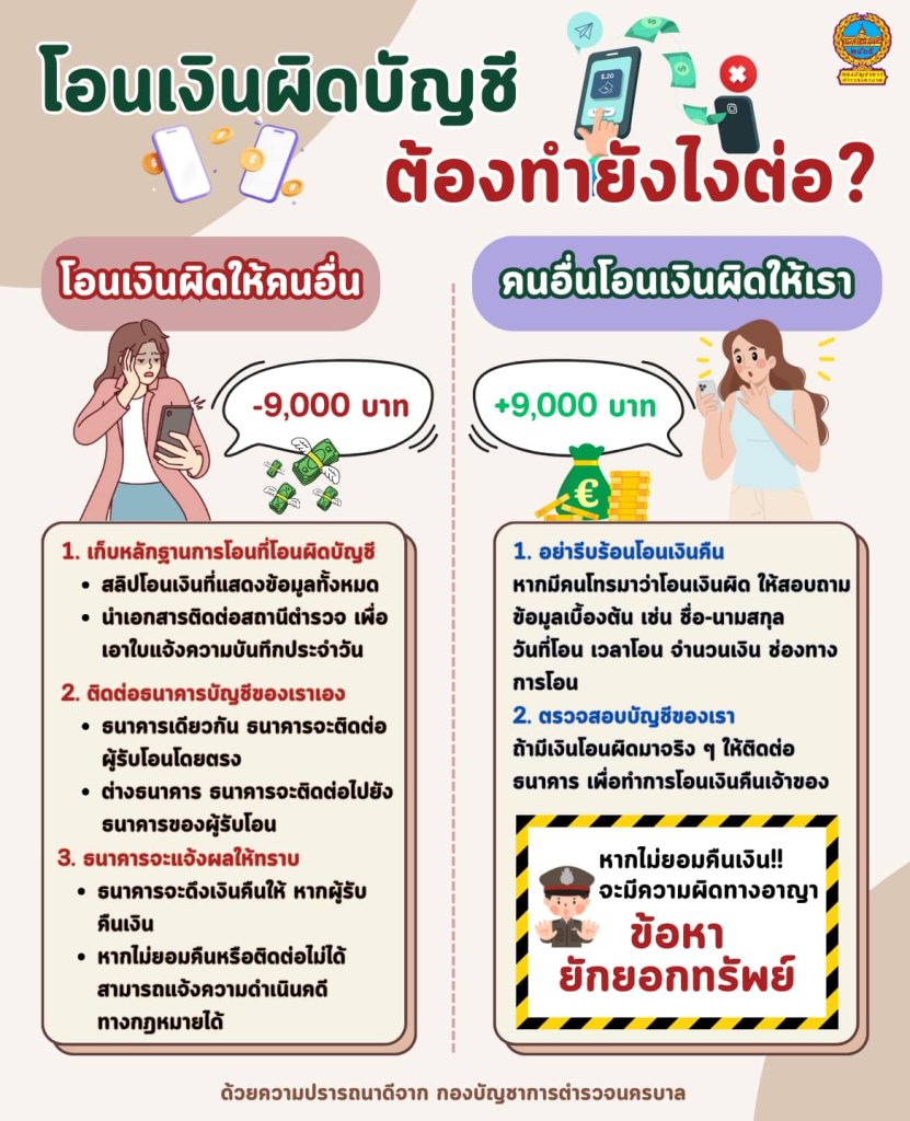 ถ้ามีเงินโอนผิดมาจริง ๆ ให้ติดต่อธนาคาร เพื่อทําการโอนเงินคืนเจ้าของ