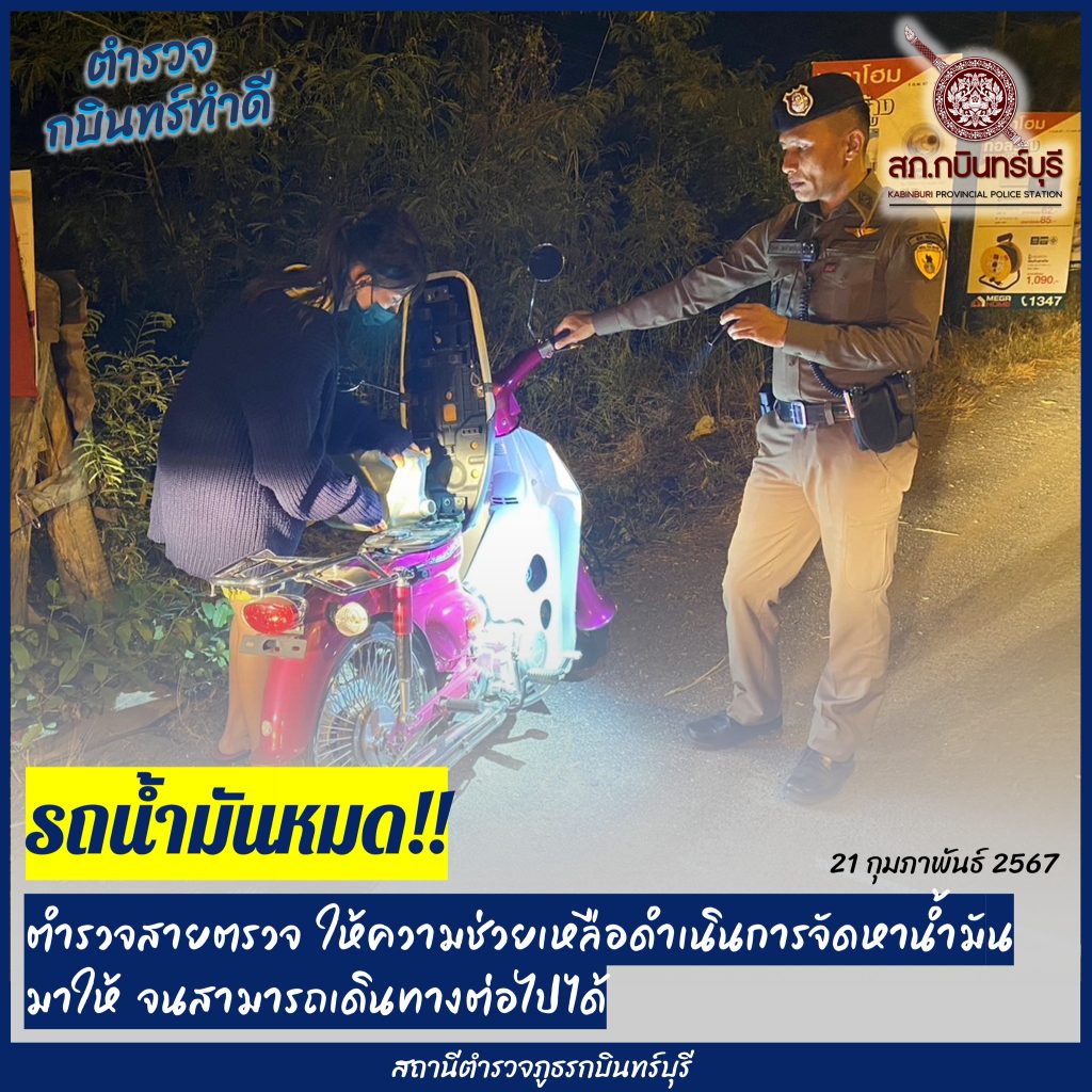 ให้ความช่วยเหลือประชาชนรถจักรยานยนต์น้ำมันหมด 21 กุมภาพันธ์ 2567 โดย kabinburi / ข่าวประชาสัมพันธ์,ข่าวกิจกรรม,ข่าวประชาสัมพันธ์,งานป้องกันปราบปราม,ตำรวจกบินทร์ทำดี วันที่ 21 ก.พ.67 เวลา 21.00 น. ร.ต.อ.ธีรพงษ์ เดชอำพรภิญโญ รอง สวป.สภ.กบินทร์บุรี พร้อมด้วยสายตรวจรถยนต์ สายตรวจรถจักรยานยนต์ ให้ความช่วยเหลือประชาชนรถจักรยานยนต์น้ำมันหมด บริเวณถนนสาย 304 ใกล้จุดกลับรถ ต.สุขภัณฑ์ สามารถเดินทางต่อได้