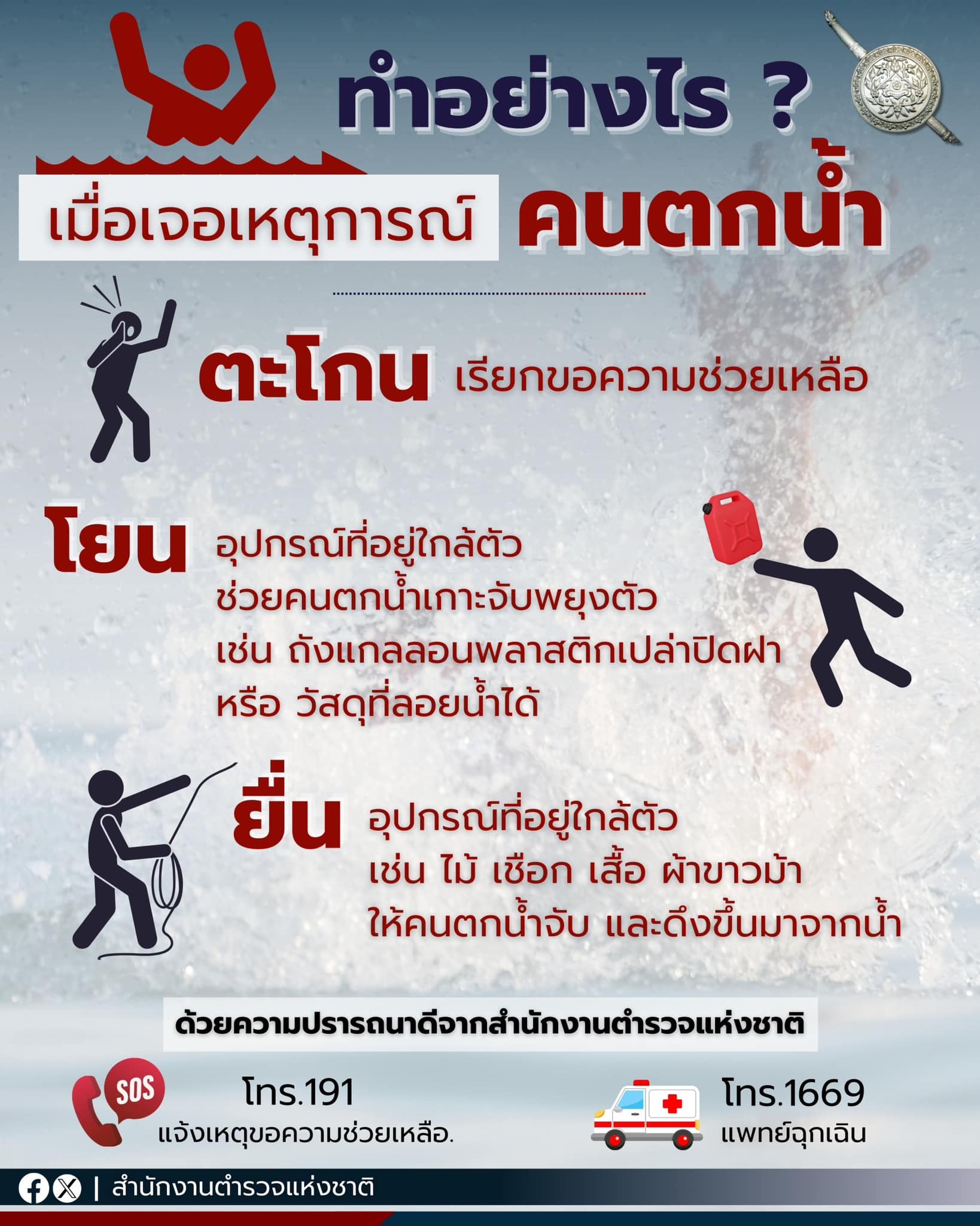 ตะโกน •โยน •ยื่น 3 วิธีช่วยเหลือ เมื่อเจอเหตุการณ์คนตกน้ำ ตะโกนเรียกขอความช่วยเหลือ โยนสิ่งของ อุปกร
