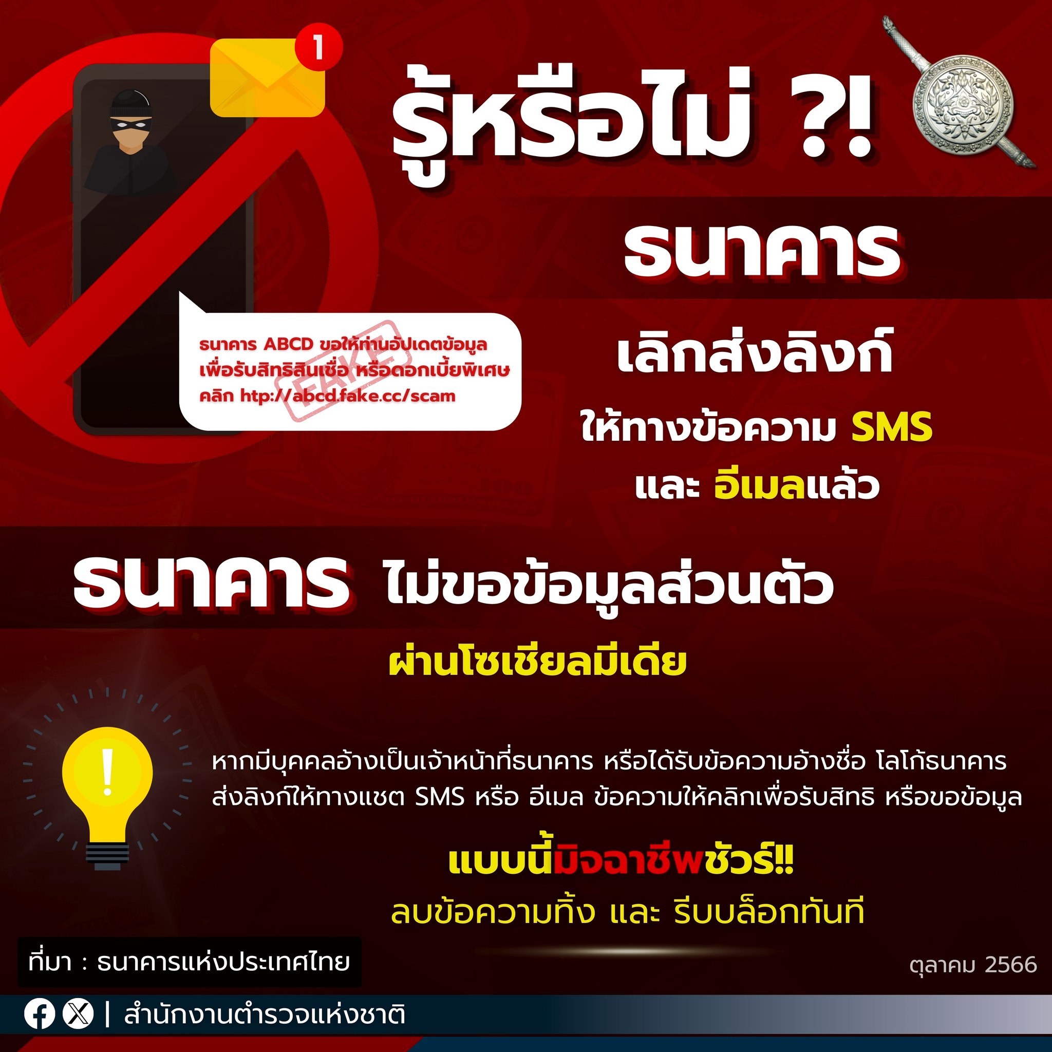รู้หรือไม่!? เรื่องสำคัญจากธนาคาร ธนาคารเลิกส่งลิงก์ให้ทางข้อความ SMS และอีเมลแล้ว ธนาคารไม่ขอข้อมูล