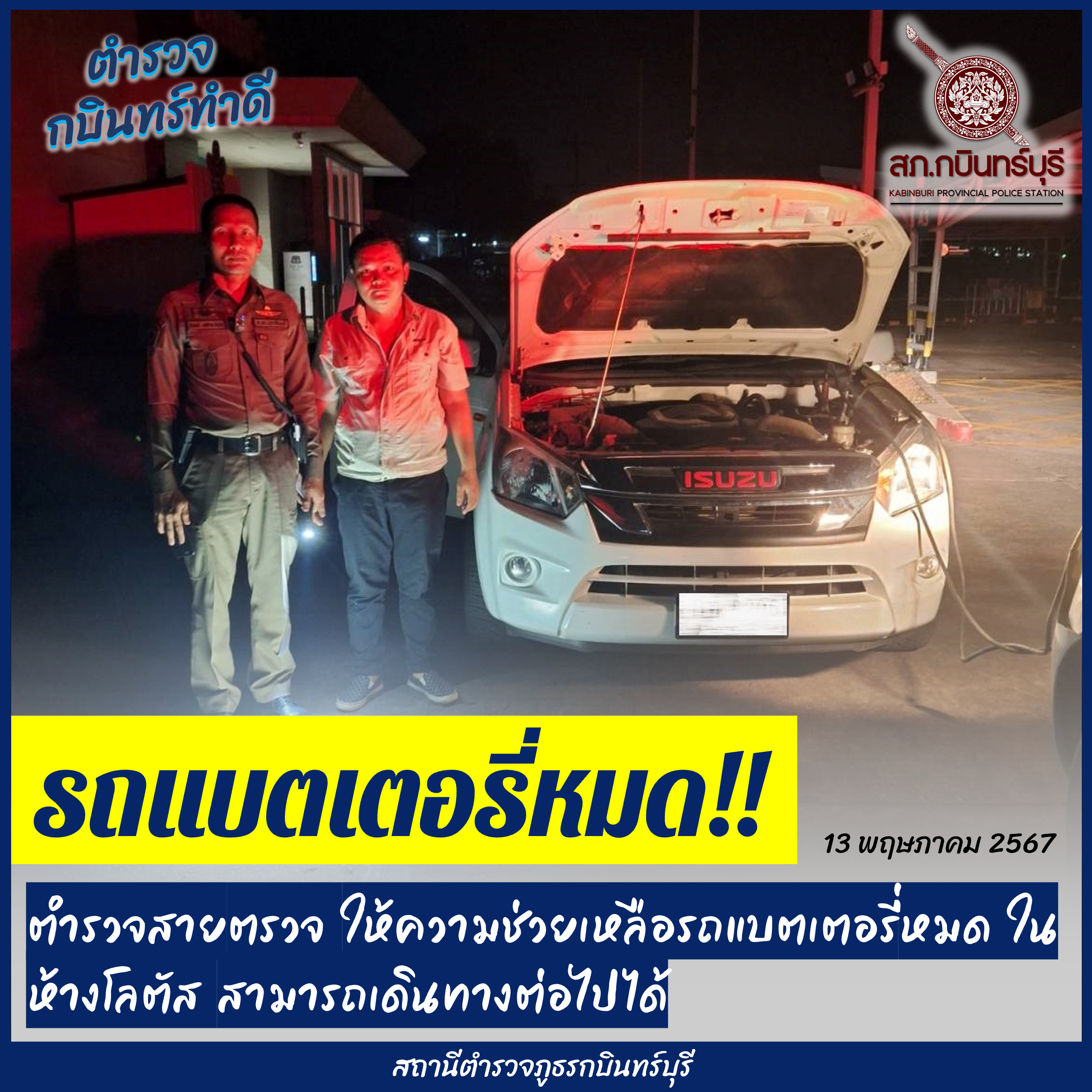 วันที่ 13 พ.ค.67 เวลา 01.59 น. ร.ต.อ.ธีรพงษ์ เดชอำพรภิญโญ รอง สวป.สภ.กบินทร์บุรี พร้อมด้วยสายตร