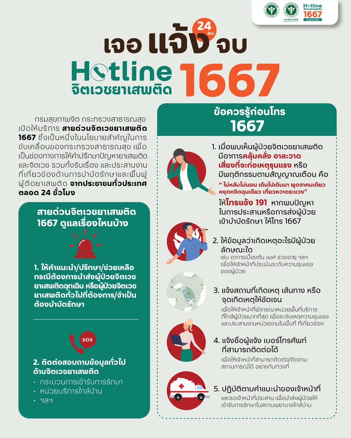 กรมสุขภาพจิตกระทรวงสาธารณสุข เปิดให้บริการ สายด่วนจิตเวชยาเสพติด 1667 เป็นช่องทางการให้คำปรึกษาปัญหา
