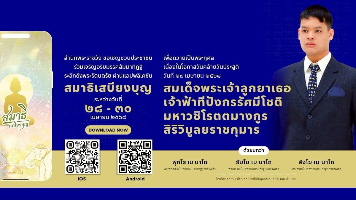 ขอเชิญชวนประชาชนร่วมเจริญอริยมรรค “สัมมาทิฏฐิ” ระลึกถึงพระรัตนตรัย ด้วยบทว่า พุทโธ เม นาโถ (พระพุทธเจ้าเป็นที่พึ่งอันประเสริฐของข้าพเจ้า) ธัมโม เม นาโถ (พระธรรมเป็นที่พึ่งอันประเสริฐของข้าพเจ้า) สังโฆ เม นาโถ (พระสงฆ์เป็นที่พึ่งอันประเสริฐของข้าพเจ้า) (โดยให้ระลึกย้ำ ๆ ซ้ำ ๆ ต่อเนื่องได้ในทุกอิริยาบถ ยืน เดิน นั่ง นอน) ถวายเป็นพระราชกุศล เนื่องในโอกาสวันคล้ายวันประสูติ สมเด็จพระเจ้าลูกยาเธอ เจ้าฟ้าทีปังกรรัศมีโชติ มหาวชิโรตตมางกูร สิริวิบูลยราชกุมาร