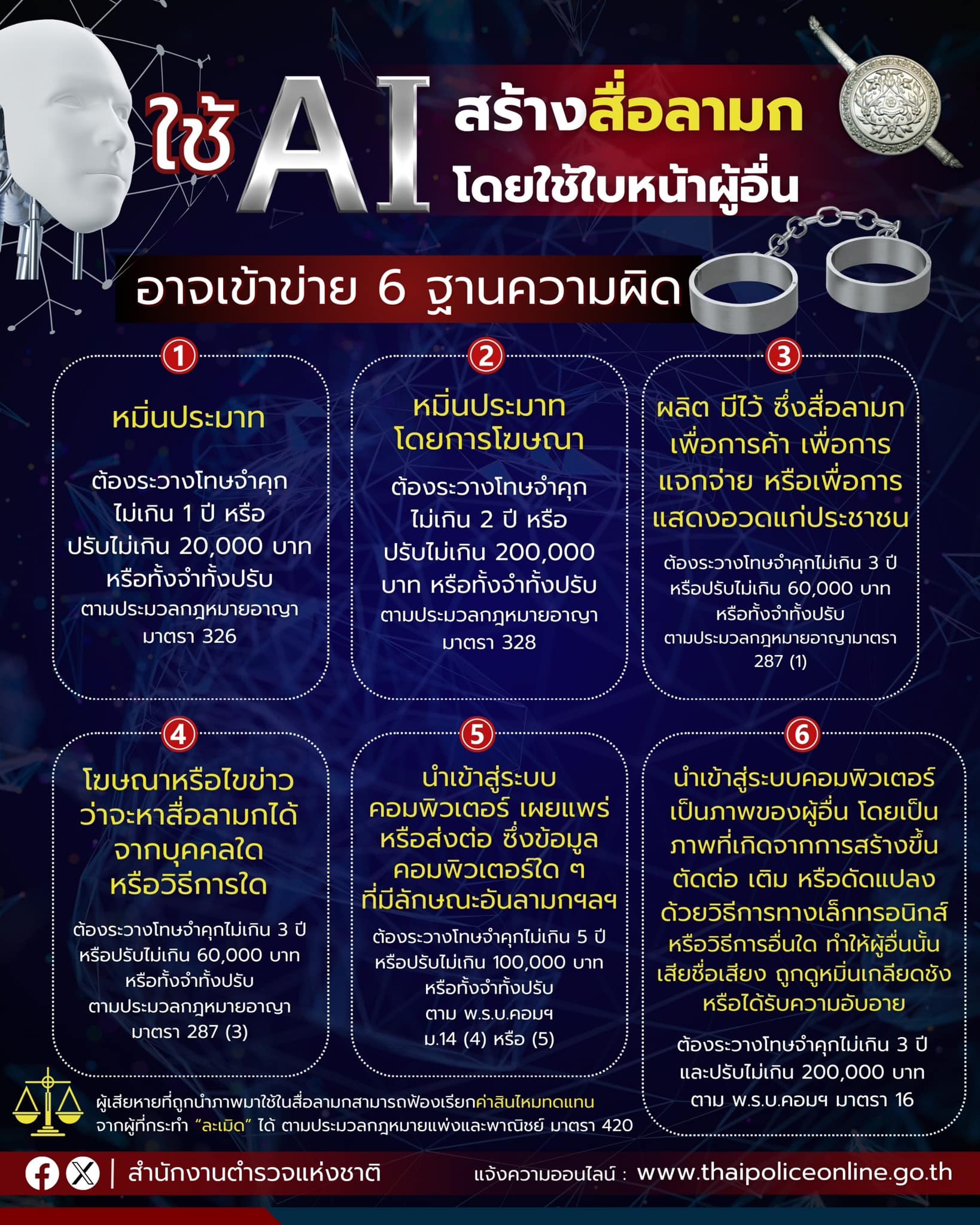 ตร. เตือน ผลิต หรือเผยแพร่ สื่อลามกสร้างด้วย AI ที่ใช้หน้าผู้อื่น โทษสูงสุด คุก 5 ปี ปรับ 200,000 บา
