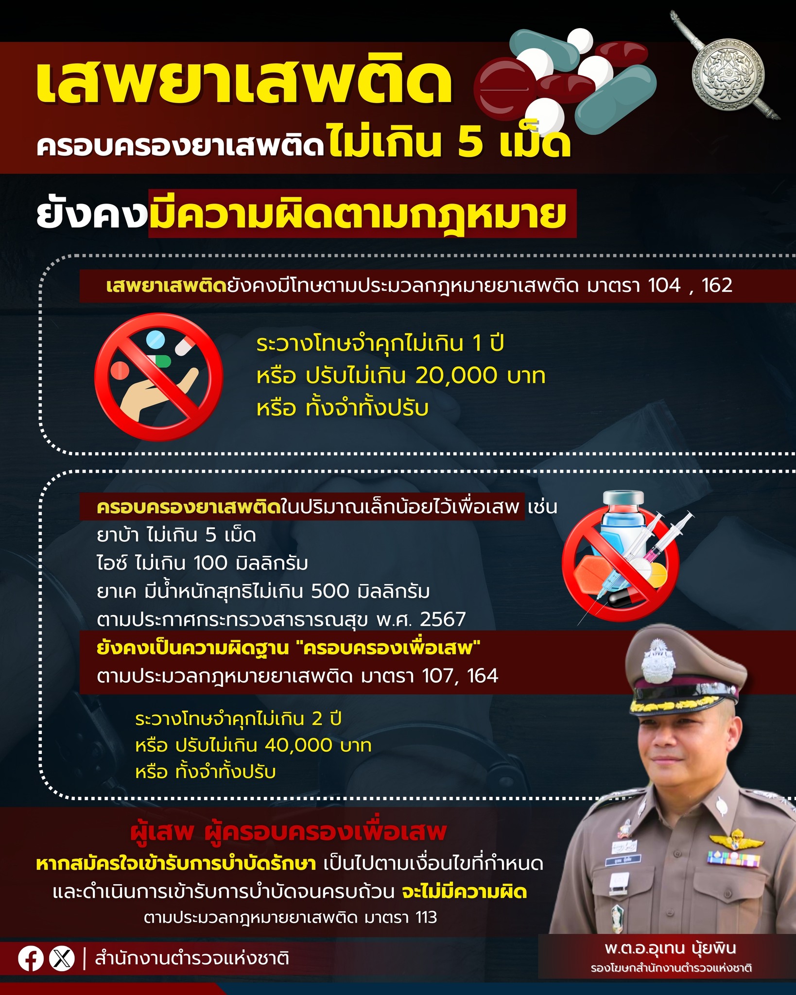 📣การเสพยาเสพติด การครอบครองยาเสพติดไม่เกิน 5 เม็ด ยังคงมีความผิดตามกฎหมาย มีโทษทั้งจำทั้งปรับ!! 🚨