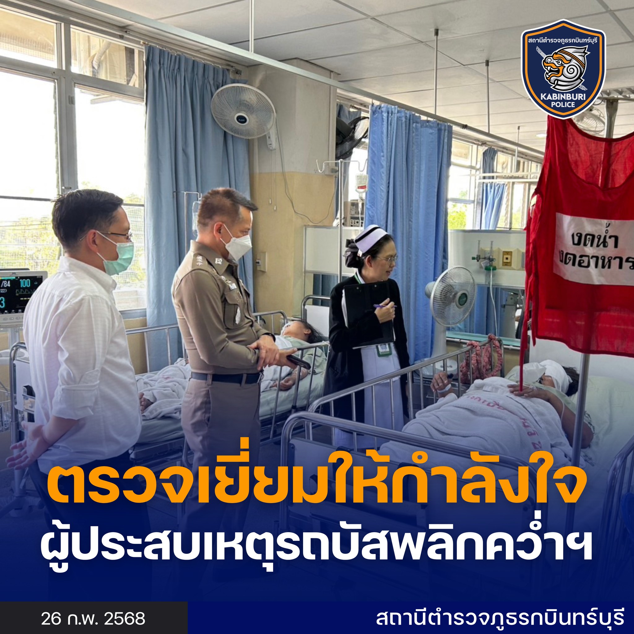 ผกก.สภ.กบินทร์บุรี เข้าตรวจเยี่ยมและให้กำลังใจผู้ได้รับบาดเจ็บจากอุบัติเหตุรถบัสคณะศึกษาดูงานเทศบาลตำบลพรเจริญ จังหวัดบึงกาฬ พลิกคว่ำถนน 304 บริเวณศาลปู่โทน
