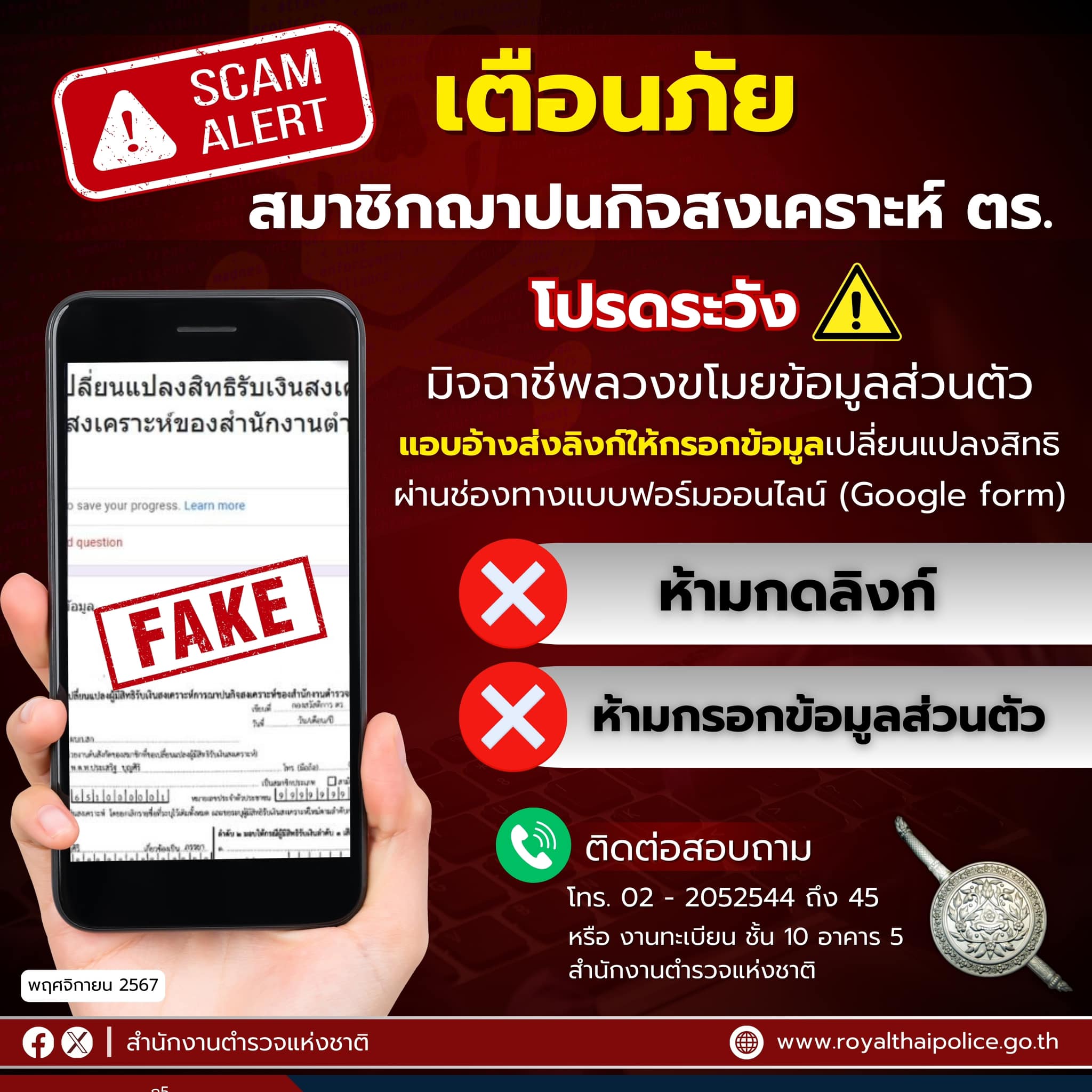 เตือนภัยออนไลน์ แจ้งเตือนสมาชิกฌาปนกิจสงเคราะห์ ตร. . โปรดระวัง . มิจฯ แอบอ้างส่งลิงก์ ลวงให้กรอกข้อ