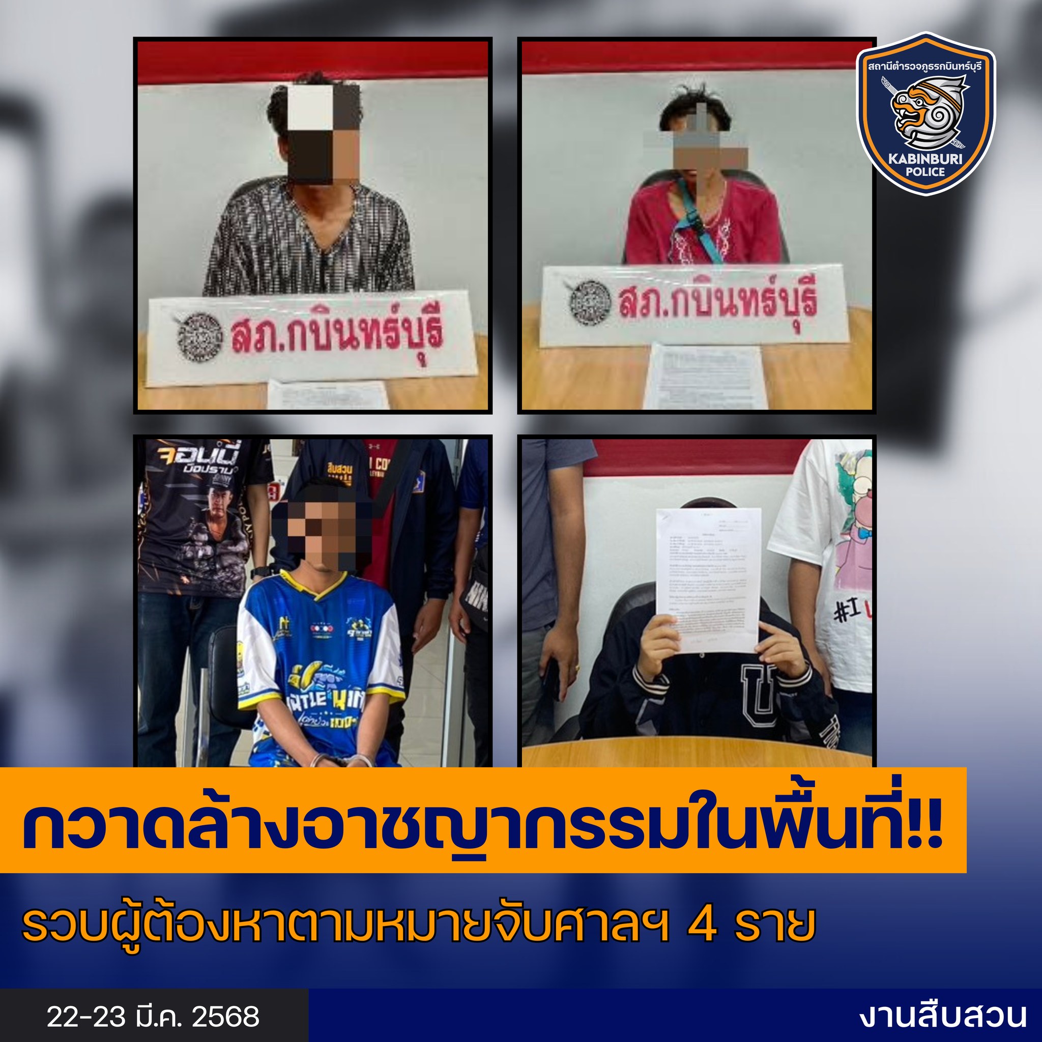 ชุดสืบสวน ระดมกวาดล้างปราบปรามอาชญากรรม ยาเสพติด อาวุธปืน บุคคลต่างด้าว และความผิดอื่นที่เกี่ยวข้อง จับกุมผู้ต้องหา 4 ราย