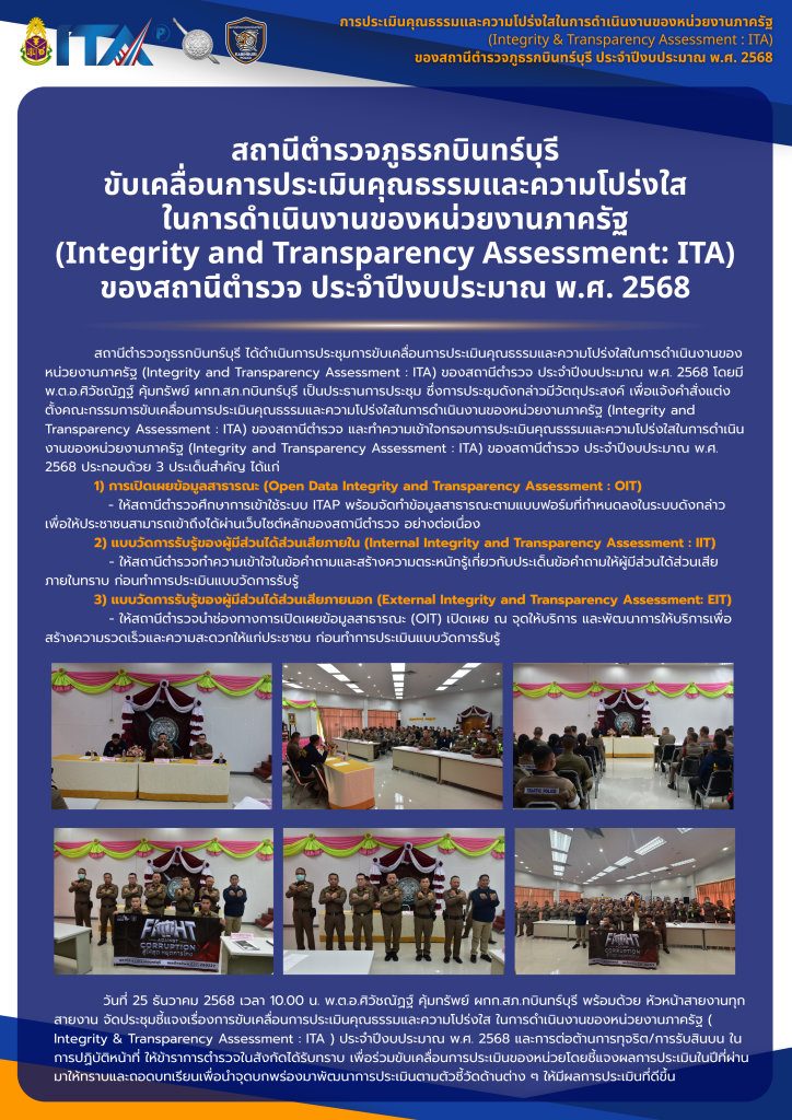 ประชาสัมพันธ์ข้อมูลการประเมินคุณธรรมและความโปร่งใส ในการดำเนินงานของหน่วยงานภาครัฐ (Integrity & Transparency Assessment : ITA) ของสถานีตำรวจภูธรกบินทร์บุรี ประจำปีงบประมาณ พ.ศ.2568