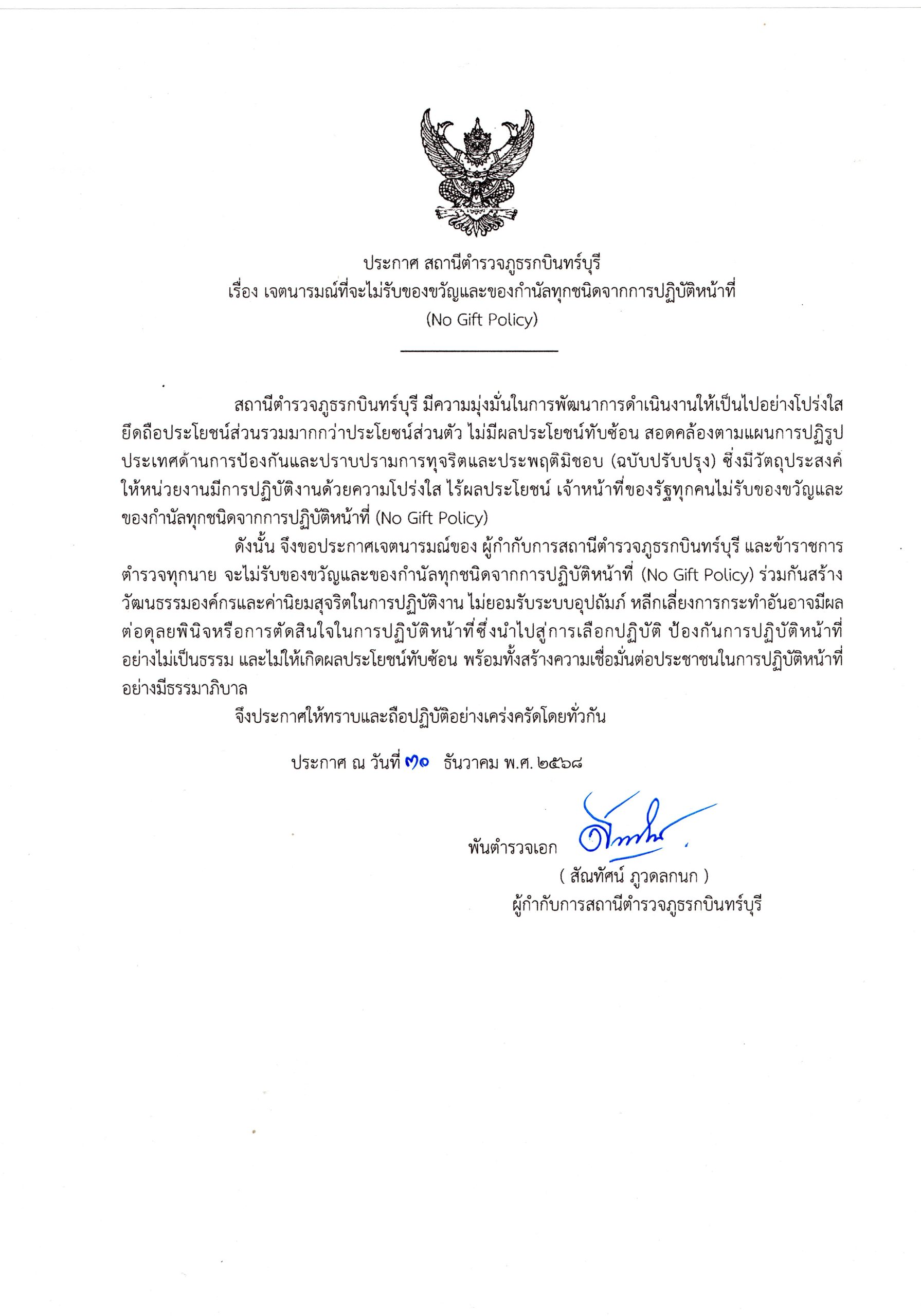 ประกาศเจตนารมณ์ที่จะไม่รับของขวัญและของกำนัลทุกชนิดจากการปฏิบัติหน้าที่ (No Gift Policy)